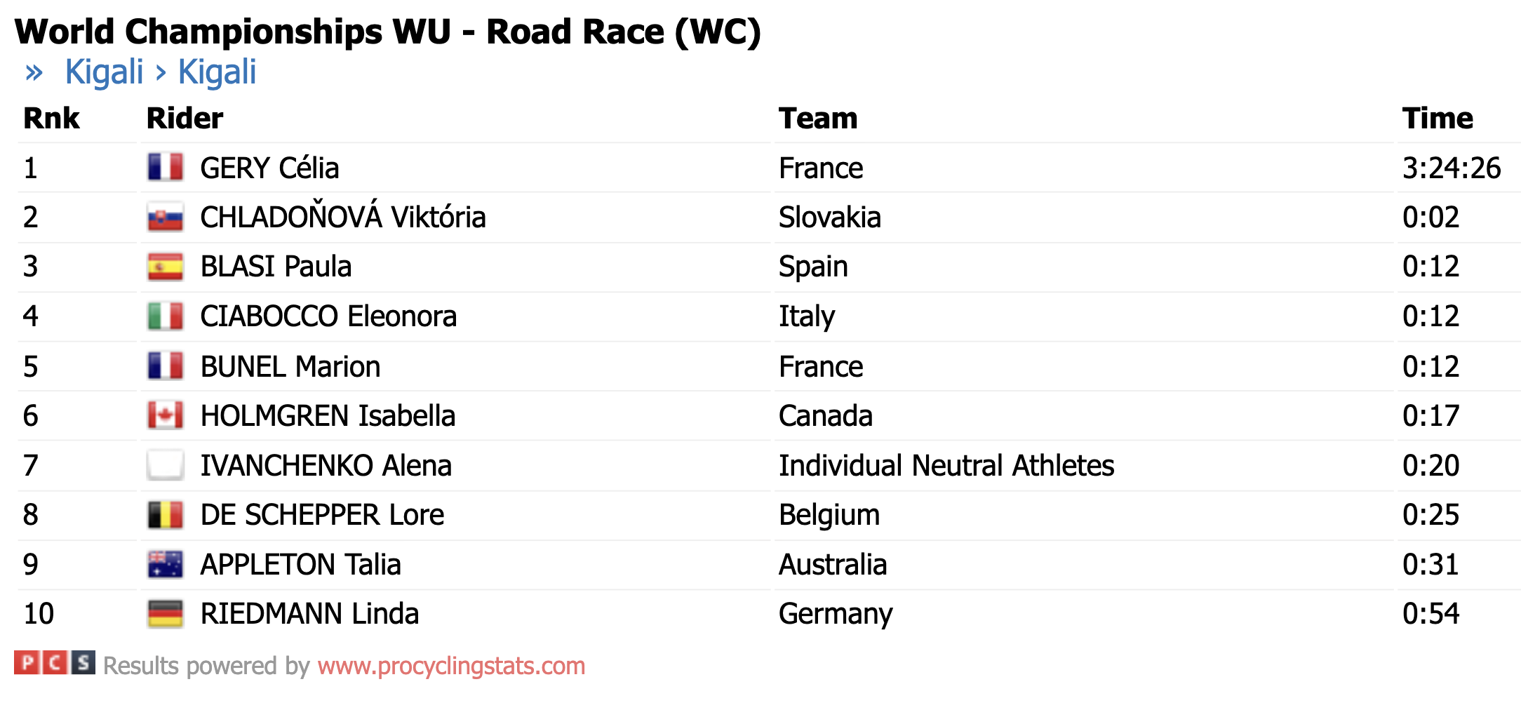 O medaile se rozhodovalo až v posledních kilometrech. Ve stoupání Côte de Kigali Golf zaútočila právě Chladoňová a vytvořila elitní skupinu favoritek. Do finiše dorazila spolu s Francouzkou Célií Geryovou, která nakonec ve spurtu zvítězila o dvě vteřiny. Třetí dojela Španělka Paula Blasiová.