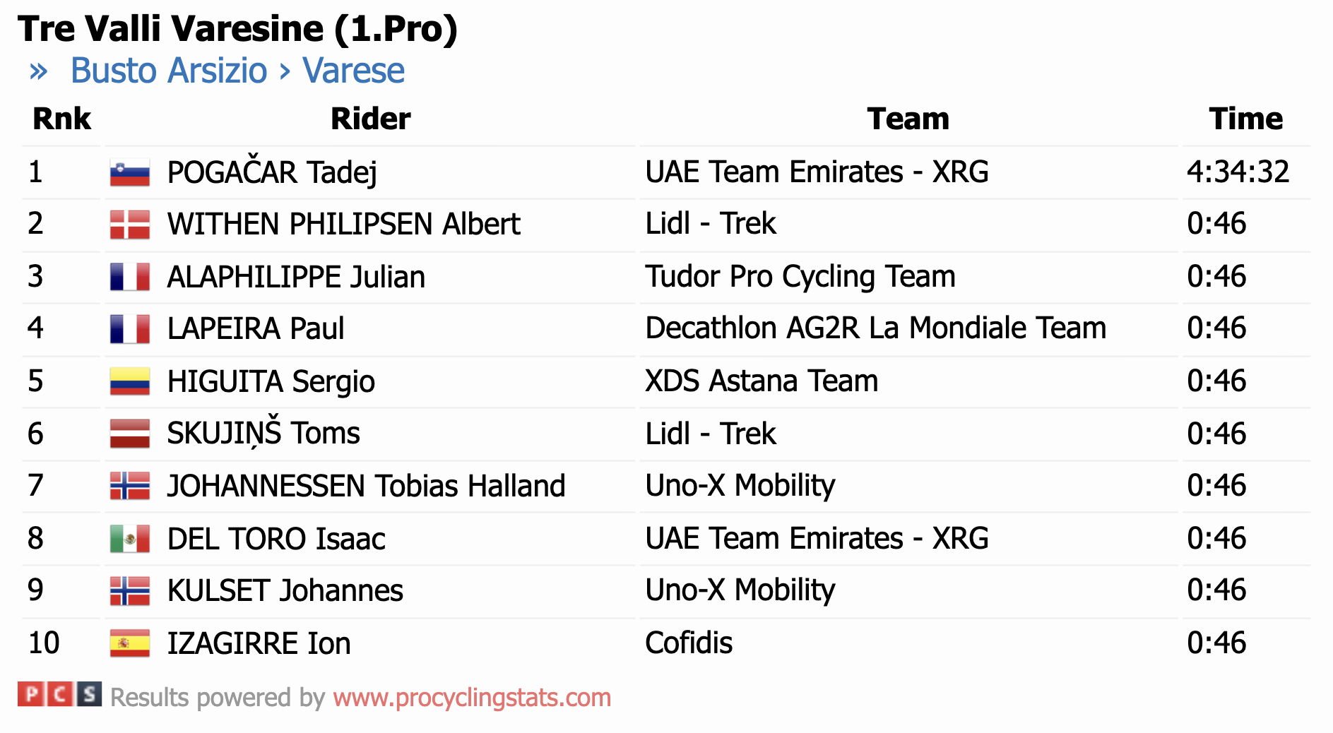 Tre Valli Varesine bylo pro Pogačara ideální generálkou na vrchol podzimní sezony, sobotní monument Okolo Lombardie. „Il Lombardia je hlavním cílem. Je to pro mě vždy obrovská motivace a jeden z největších závodů roku. Nebojím se, moje nohy budou v sobotu v pořádku,“ ujistil fanoušky.