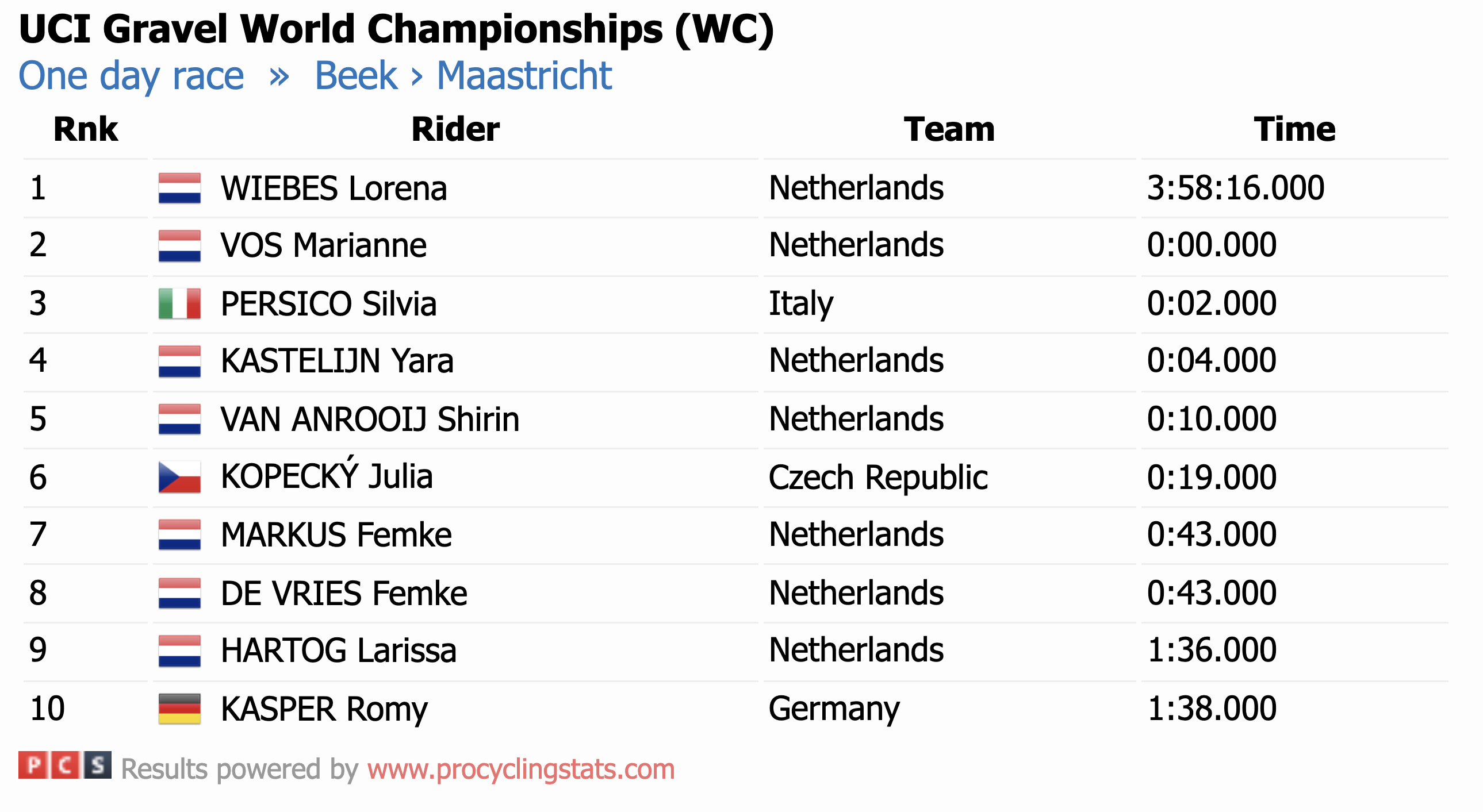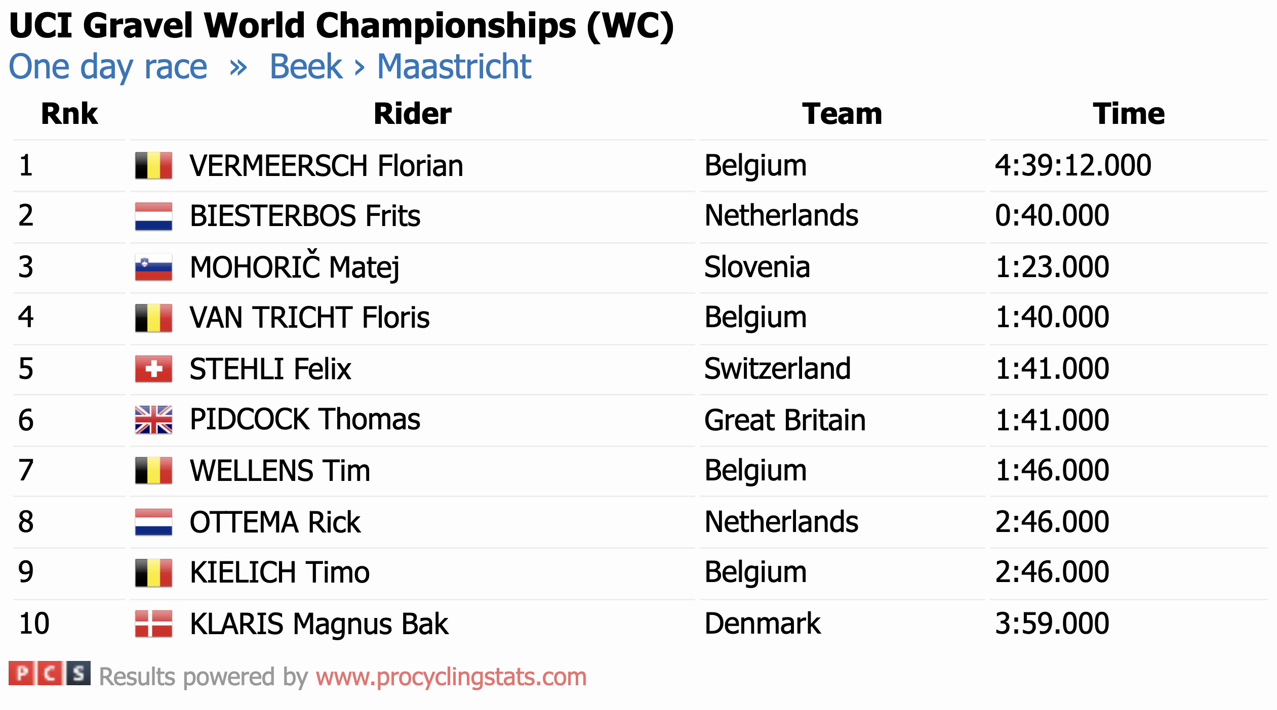 Čtvrté mistrovství světa v gravelu potvrdilo dominanci silničářů. Ženský titul zůstal v Nizozemsku díky Loreně Wiebes, zatímco mezi muži se po dvou druhých místech konečně dočkal zlata Belgičan Florian Vermeersch. Nejlepším Čechem byl Adam Ťoupalík na 24. příčce.