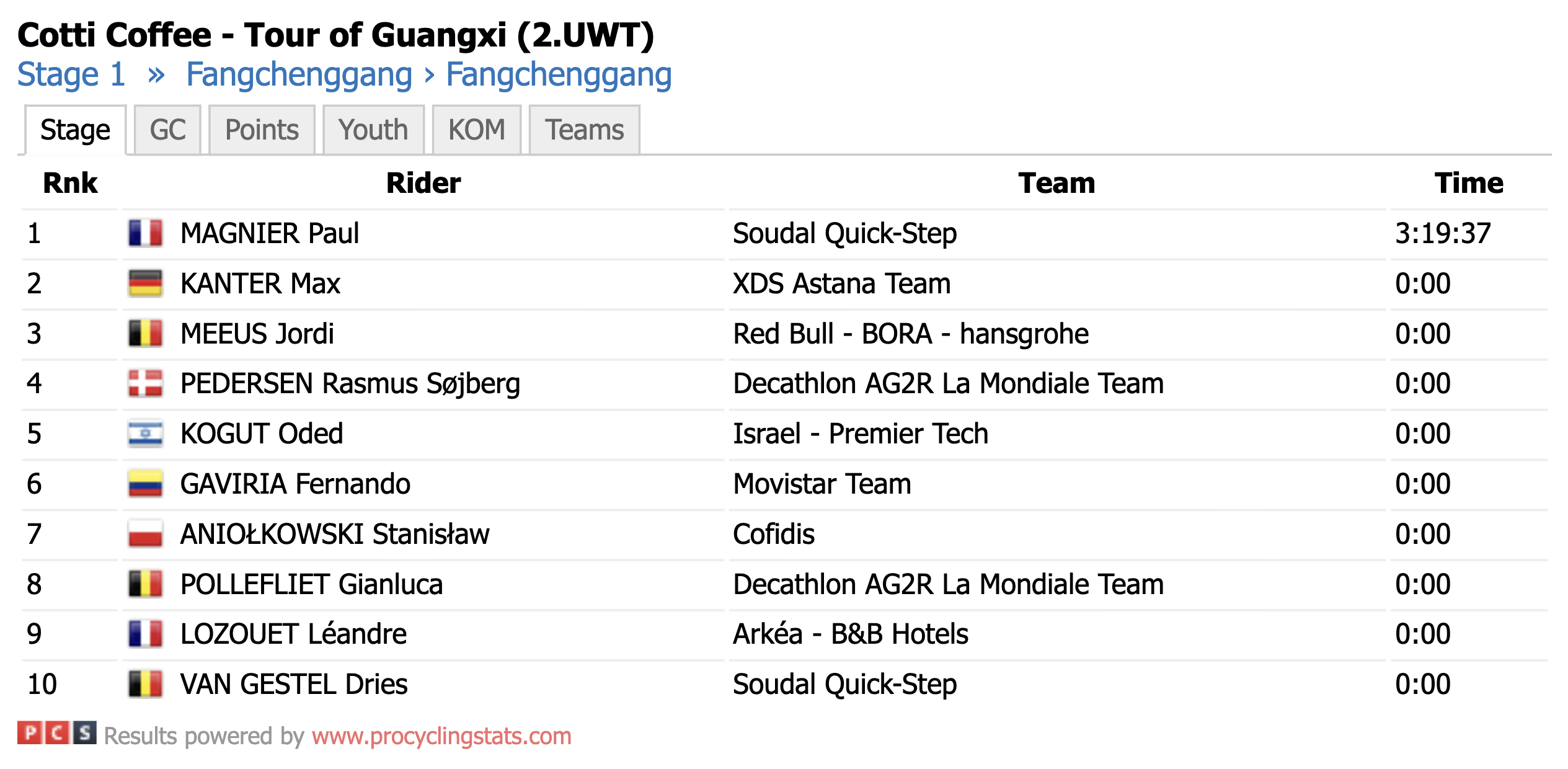 První etapa šestého ročníku čínské Tour of Guangxi (2.UWT) se podle očekávání rozhodovala v hromadném dojezdu. Ten ovlivnil pád přibližně šest set metrů před cílem. Mezi jezdci, které incident zbrzdil, byl i Pavel Bittner. Z vítězství se radoval Paul Magnier, který tak potvrdil svou skvělou formu v závěru sezony, kdy už získal deset vítězství během jednoho měsíce.