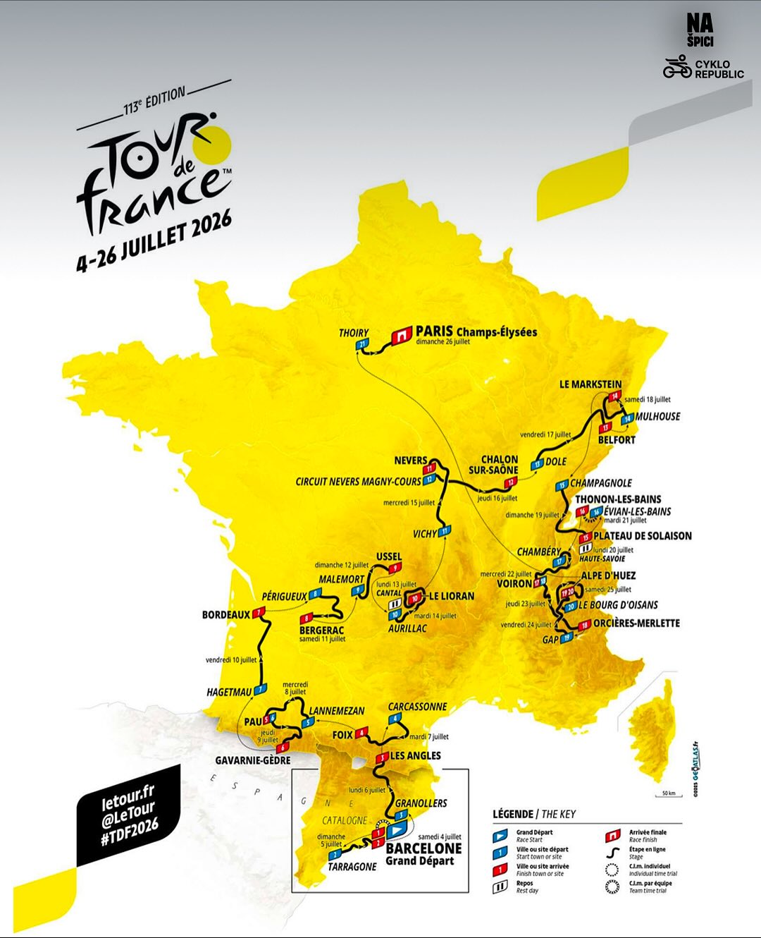 Organizátoři představili trasu Tour de France 2026. Závod se bude držet trendu posledních let a místo dlouhých časovek či nekonečných horských etap nabídne kratší a intenzivnější profil. Start proběhne v Barceloně, peloton brzy zamíří do Pyrenejí a o žlutém trikotu se definitivně rozhodne až v Alpách během dvou po sobě jdoucích dojezdů na Alpe d’Huez.