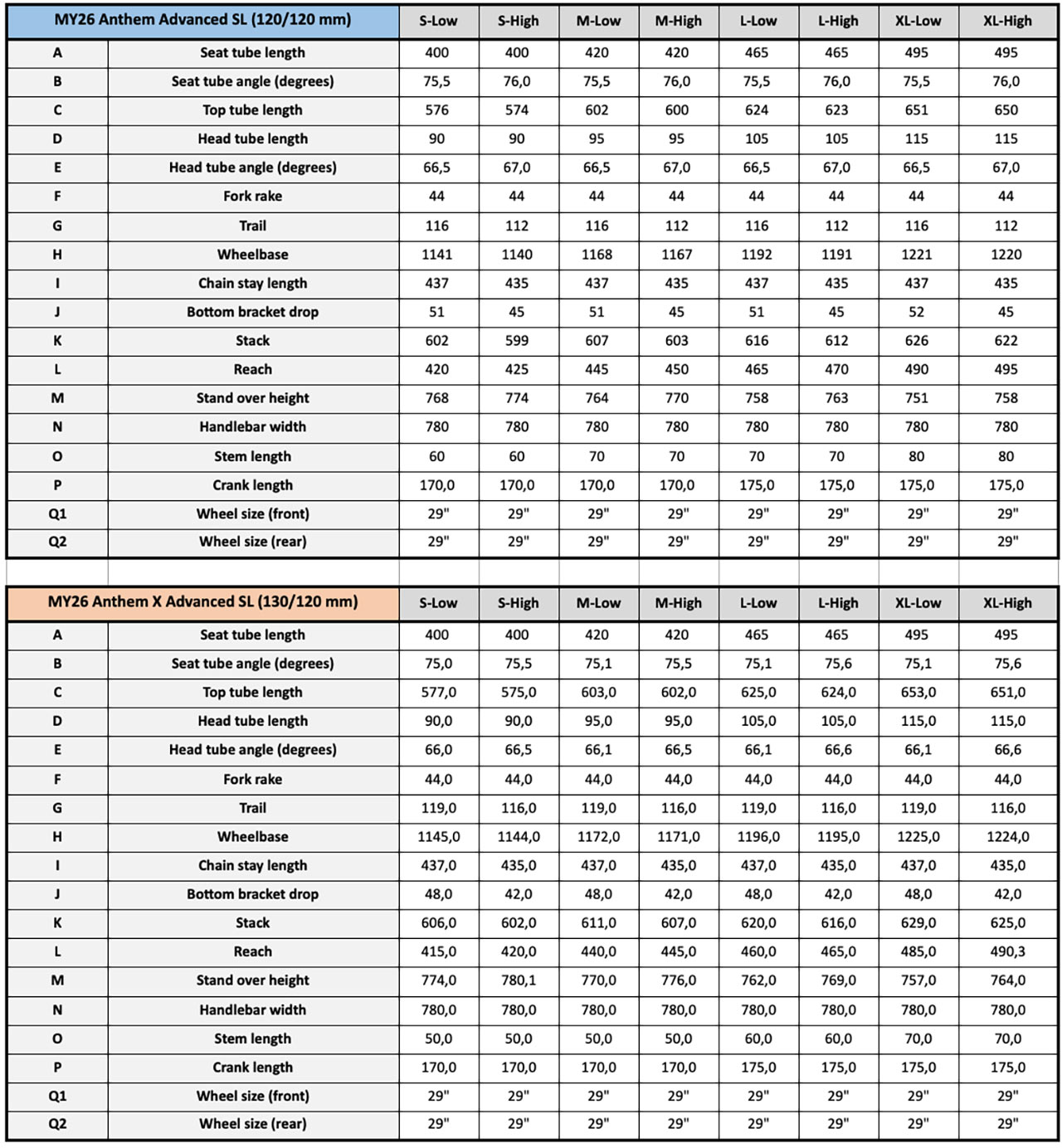 Závodní verze Anthem Advanced SL nabízí 120 mm zdvihu vpředu i vzadu a klade důraz na co nejnižší hmotnost. Trailově zaměřený Anthem X Advanced SL přidává vidlici se zdvihem 130 mm, vnitřní úložný prostor a univerzálnější charakter vhodný i pro technické tratě.