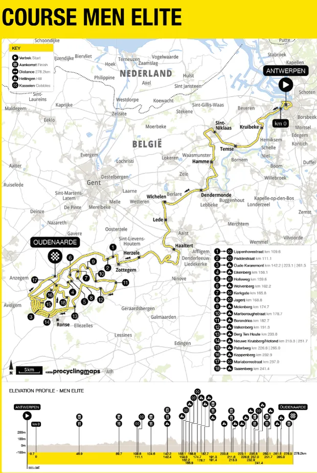 Trasa měřící úctyhodných 278 kilometrů prověří peloton celkem šestnácti stoupáními (často dlážděnými) a sedmi rovinatými úseky na kostkách. Klíčové momenty závodu začínají zhruba 150 kilometrů před cílem při prvním nájezdu na ikonický Oude Kwaremont.
