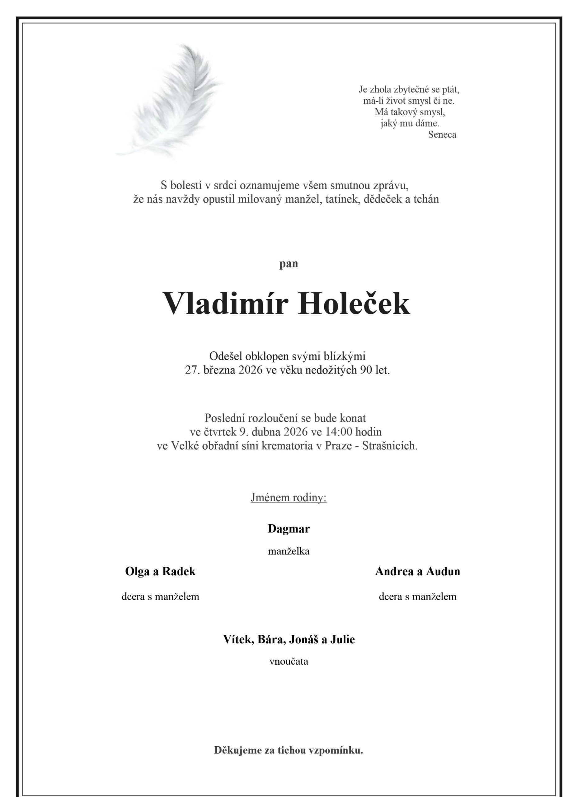 Poslední rozloučení s Vladimírem Holečkem se koná 9. dubna v Praze