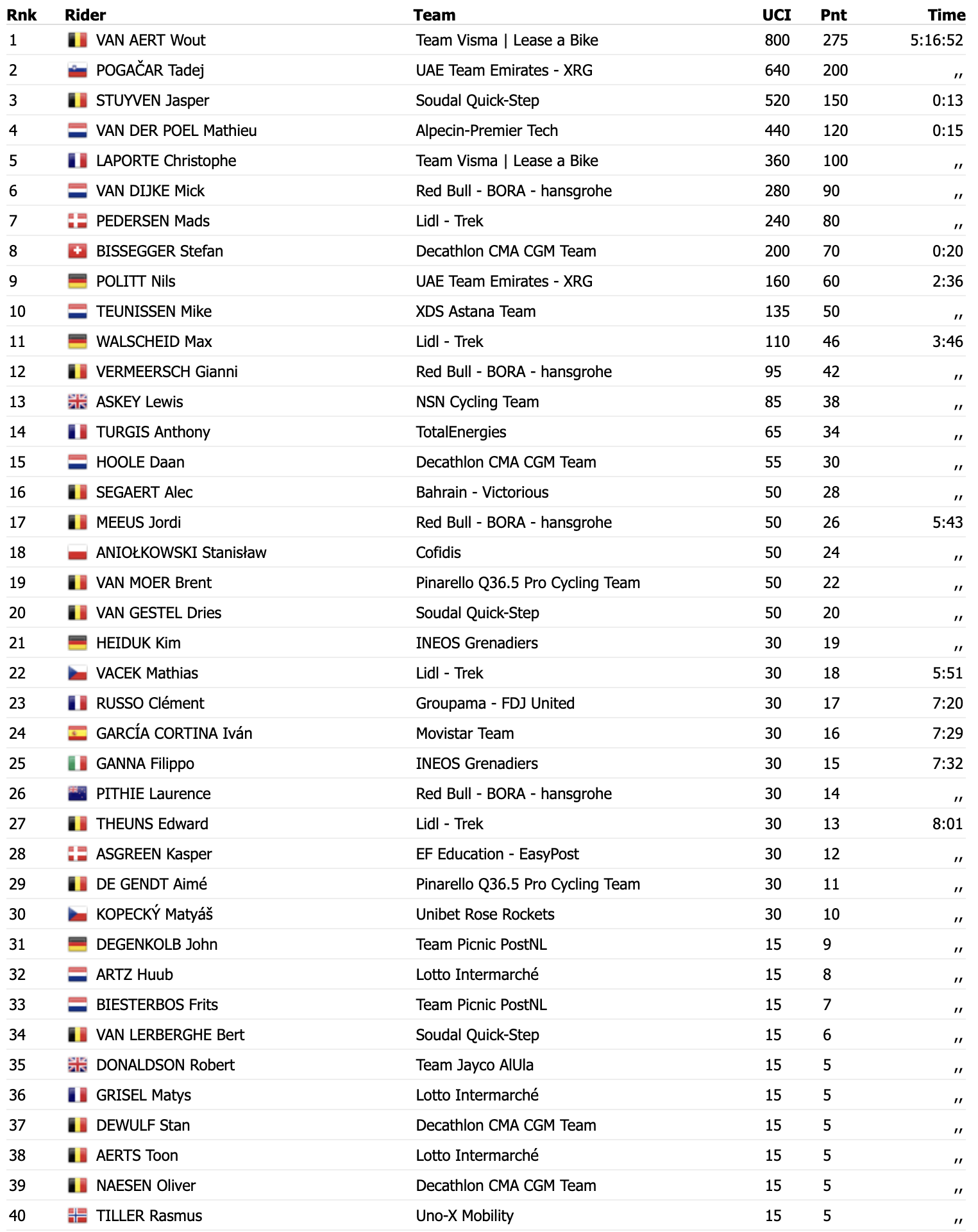 Pro bronzovou pozici si s třináctivteřinovým odstupem dojel další domácí závodník Jasper Stuyven. Až pod stupni vítězů se tentokrát umístil nizozemský univerzál Mathieu van der Poel, který přitom ovládl předchozí tři ročníky tohoto závodu. Z českých barev se nejvíce dařilo Mathiasu Vackovi, jenž projel cílem s téměř šestiminutovým mankem na 22. místě. Do nejlepší třicítky se vešel i Matyáš Kopecký.