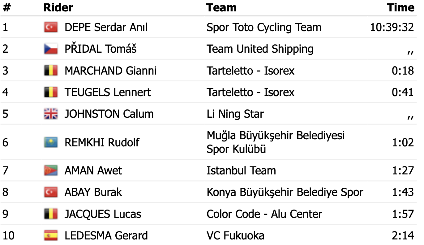 Samotný závěr závěrečného dějství vyvrcholil podle očekávání hromadným dojezdem pelotonu. Z etapového prvenství se radoval další zástupce turecké cyklistiky Mustafa Tarakci. Tomáš Přidal proťal cílovou pásku bezpečně schovaný v hlavním balíku, připsal si 35. pozici a dojel ve zcela shodném čase jako vítěz.