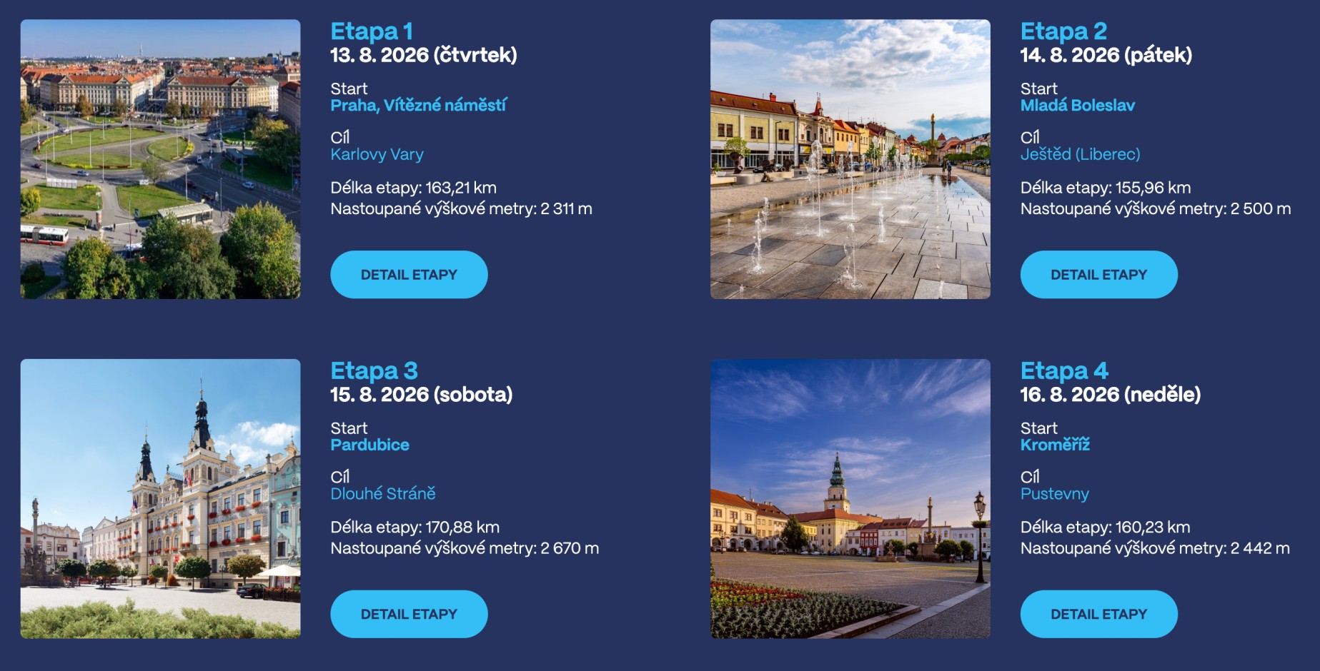 - 1. etapa: Praha – Karlovy Vary (163 km, převýšení 2 311 m)