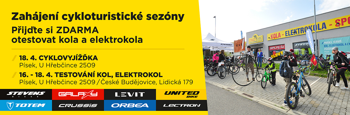 Ve dnech 16.-18. dubna 2026 si mohou zájemci v prodejnách Cyklošvec v Písku a Českých Budějovicích vyzkoušet širokou nabídku kol a elektrokol. K dispozici budou modely značek jako Stevens, Galaxy, Totem, Orbea, Levit, Lectron, Crussis nebo Teewing. V sobotu 18. dubna budou obě prodejny otevřeny do 16 hodin.
